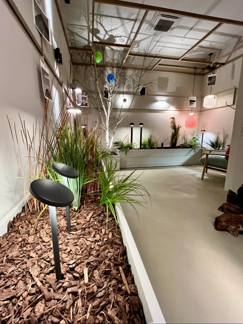 Traiano Luci, leader nel settore illuminazione su Torino, ci ha coinvolti nell'allestimento di uno spazio del nuovo negozio dedicato all'illuminazione outdoor. Essendo uno spazio chiuso e non illuminato da luce naturale abbiamo avuto per la prima volta un approccio molto diverso dal solito: abbiamo infatti inserito piante finte e stabilizzate. Quest'esperienza ci permette di far conoscere un modo diverso di inserire il verde anche nei contesti architettonici che non danno spazio alla vegetazione viva.