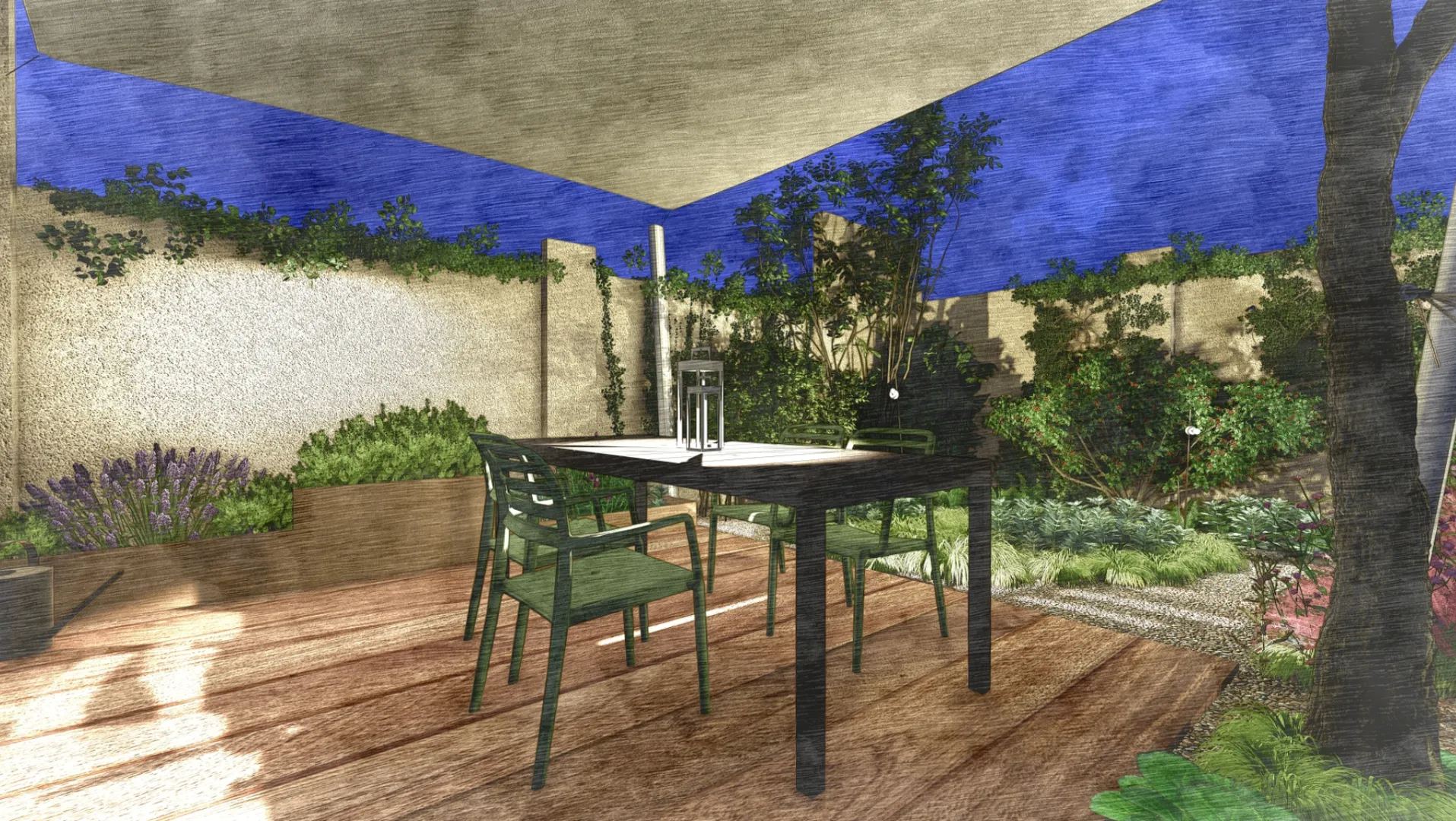 Nel quartiere Cit Turin, una bella abitazione a due piani si affaccia su di un giardino che ha il sapore del carattere riservato dei torinesi. Uno spazio raccolto, contraddistinto da due alberi di terza grandezza, molto slanciati, che pur non impedendo al sole di illuminare lo spazio, fanno una piacevole ombra. A terra abbiamo giocato con due materiali, la ghiaia e il gres, che incontrano un tappeto vegetato che crea diversi volumi e forme. Un percorso di piastrelle effetto legno accompagna alla zona living, ombreggiata da una vela rettangolare. Un’amaca si tende tra i due alberi promettendo un dolce riposo immerso nel verde. Illuminano il giardino i picchetti Chiodo di Platek, i picchetti Pois di Karman e sul tavolo la lampada ricaricabile Eterea by Platek.