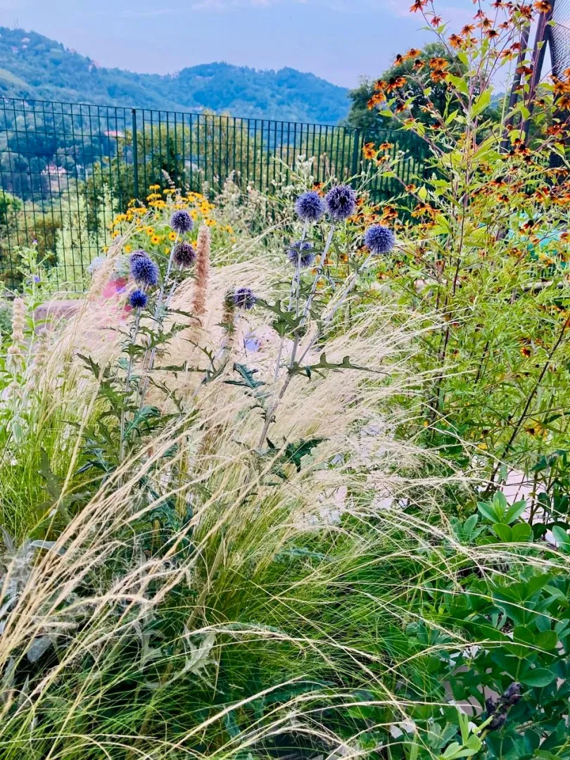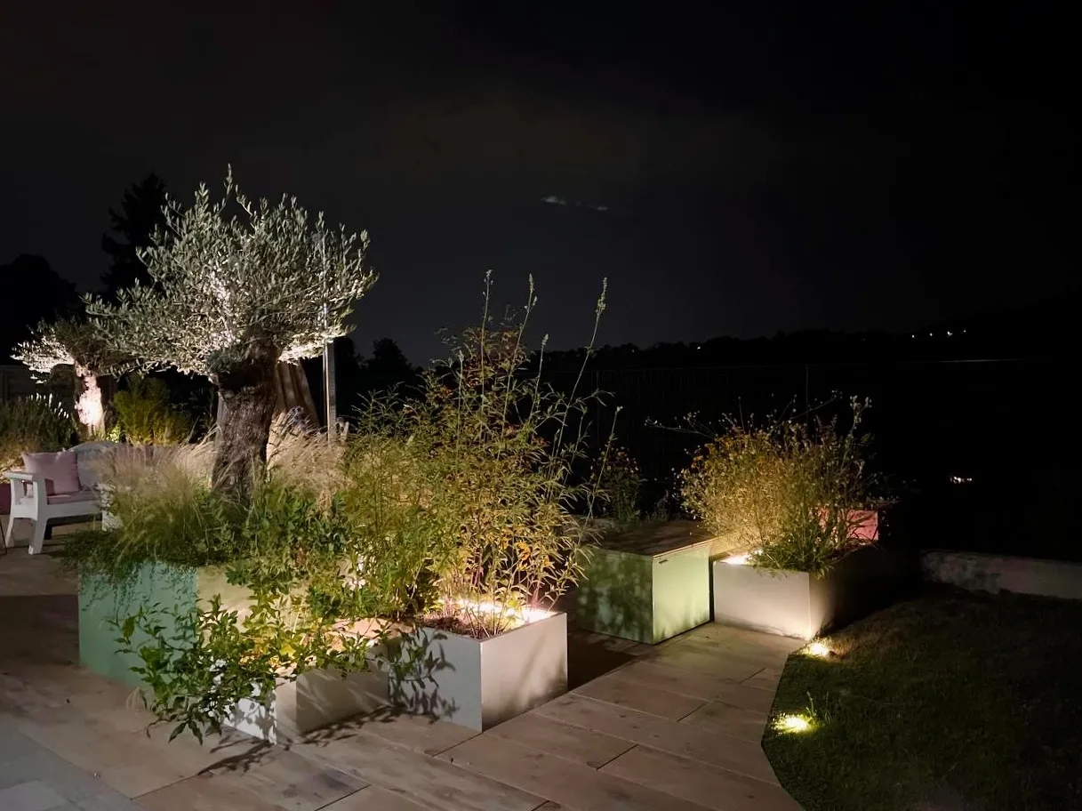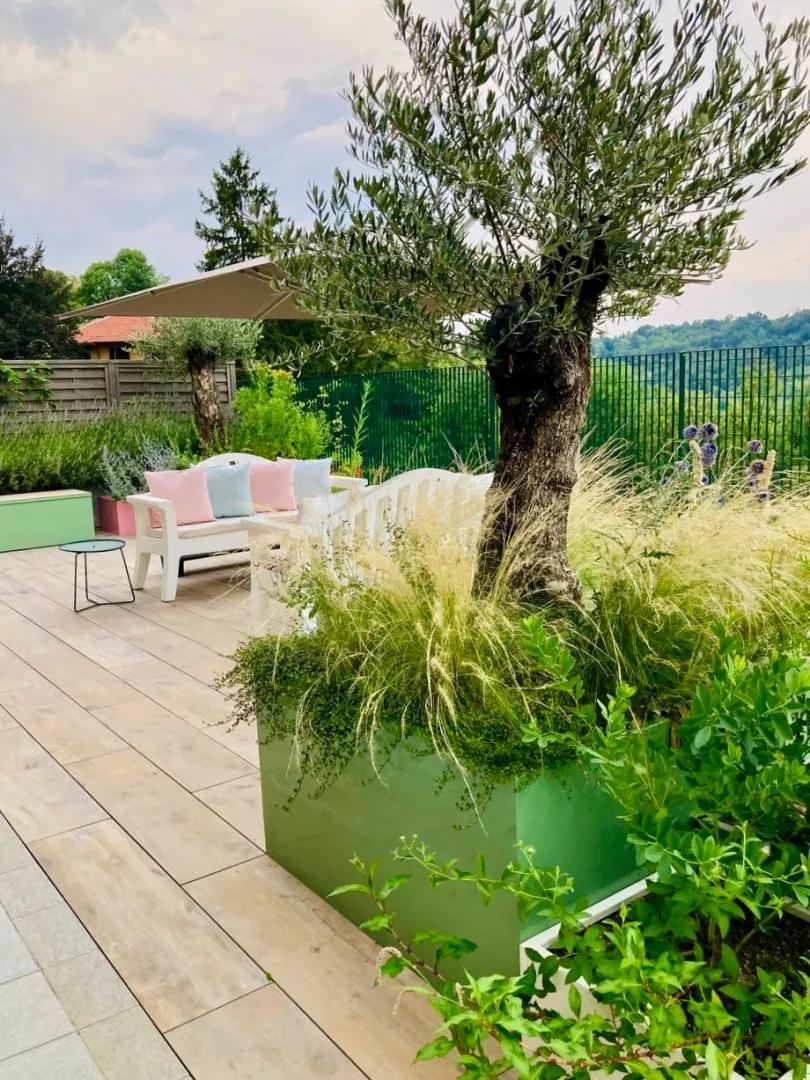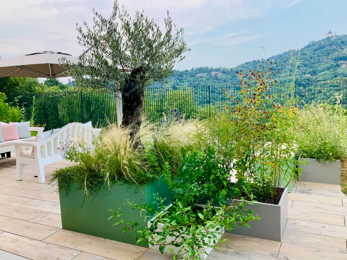 In questo giardino terrazzato sulla collina torinese abbiamo studiato assieme al cliente una soluzione che riuscisse a soddisfare le sue esigenze: avere uno spazio outdoor di facile gestione con zone pavimentate dove poter inserire arredo da esterni e creare delle aree ben definite dedicate alla vegetazione. Così abbiamo progettato il giardino con una serie di contenitori per le piante in appoggio diretto sul terreno con volumi differenti, quasi come un tetris, che andassero ad inserirsi a spot nel disegno della nuova pavimentazione galleggiante. La vegetazione è stata studiata per dare più colore possibile, abbiamo infatti giocato con diverse specie erbacee, che con il susseguirsi delle stagioni svettano con le loro fioriture su questo bellissimo affaccio collinare.
