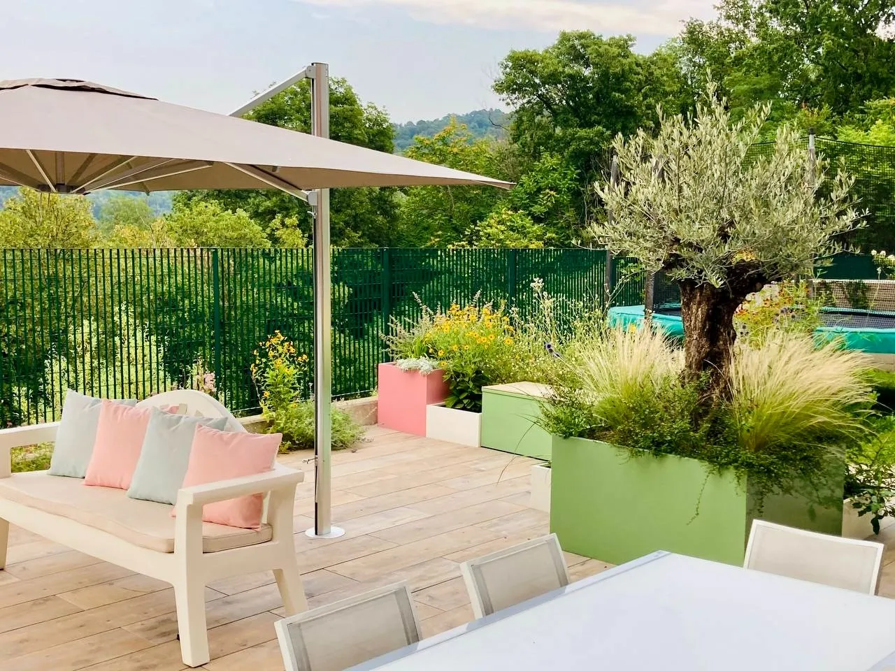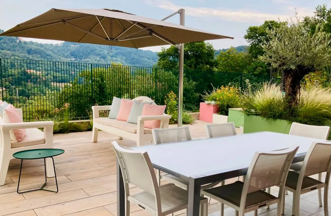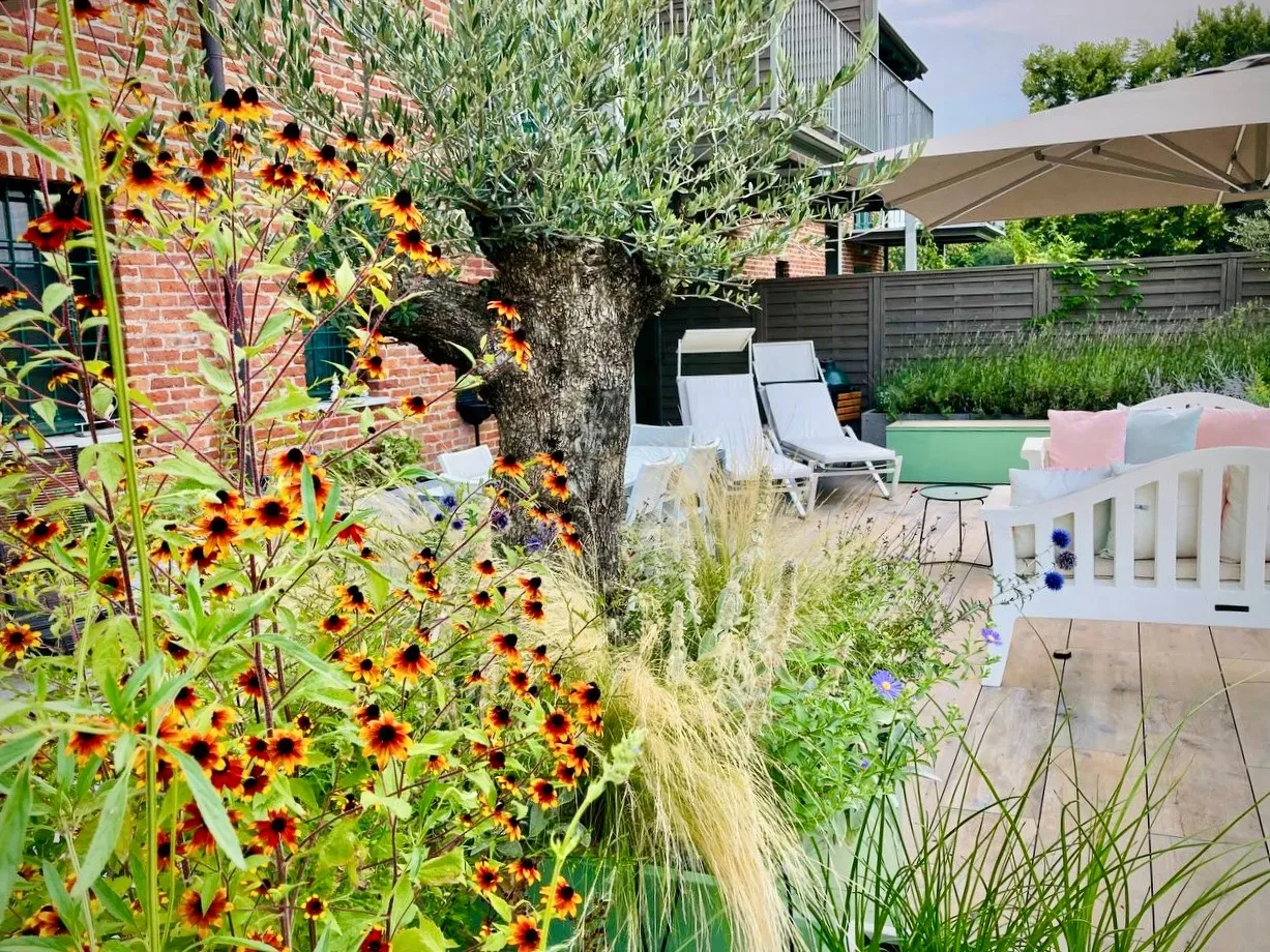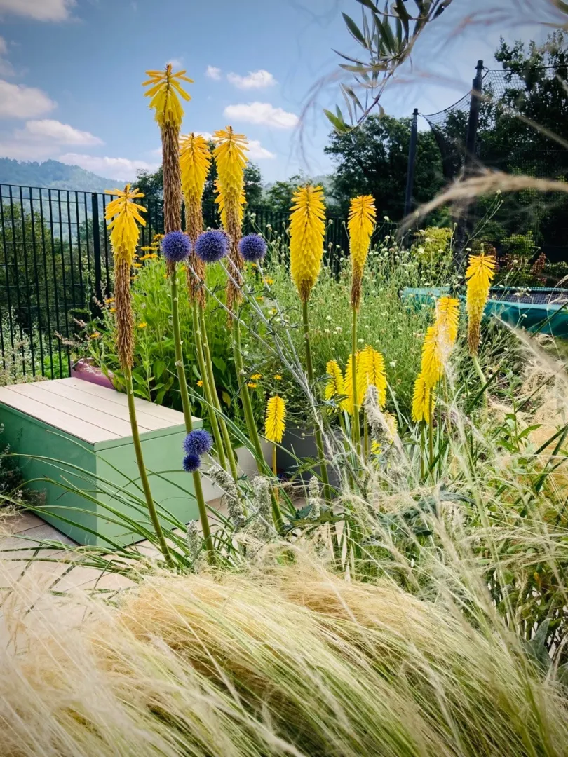 In questo giardino terrazzato sulla collina torinese abbiamo studiato assieme al cliente una soluzione che riuscisse a soddisfare le sue esigenze: avere uno spazio outdoor di facile gestione con zone pavimentate dove poter inserire arredo da esterni e creare delle aree ben definite dedicate alla vegetazione. Così abbiamo progettato il giardino con una serie di contenitori per le piante in appoggio diretto sul terreno con volumi differenti, quasi come un tetris, che andassero ad inserirsi a spot nel disegno della nuova pavimentazione galleggiante. La vegetazione è stata studiata per dare più colore possibile, abbiamo infatti giocato con diverse specie erbacee, che con il susseguirsi delle stagioni svettano con le loro fioriture su questo bellissimo affaccio collinare.