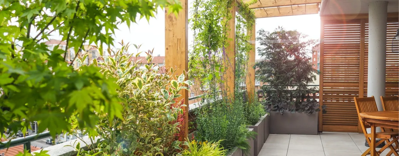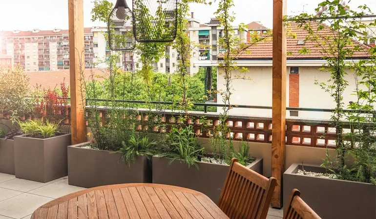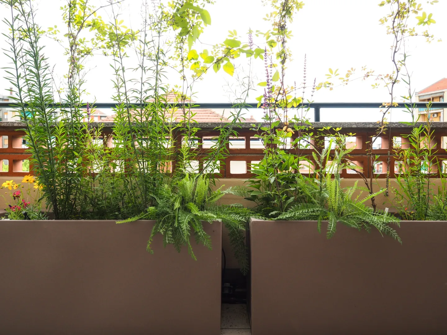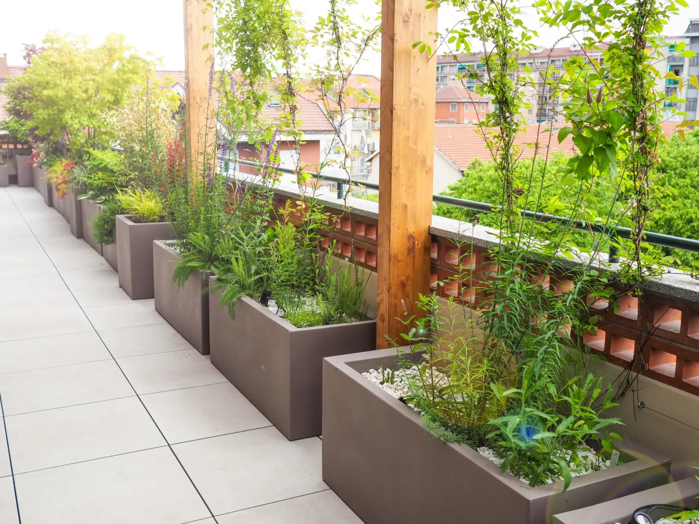 Abbiamo progettato e realizzato questo lungo terrazzo cercando di soddisfare tutte le esigenze dei proprietari: schermare dal vento, proteggere dal sole, nascondere dalla vista i palazzi adiacenti e inserire più verde possibile. Il cliente ci ha chiesto di lasciare uno spazio fra il verde perimetrale nel punto in cui si vedono le montagne e tramonta il sole… richiesta soddisfatta.