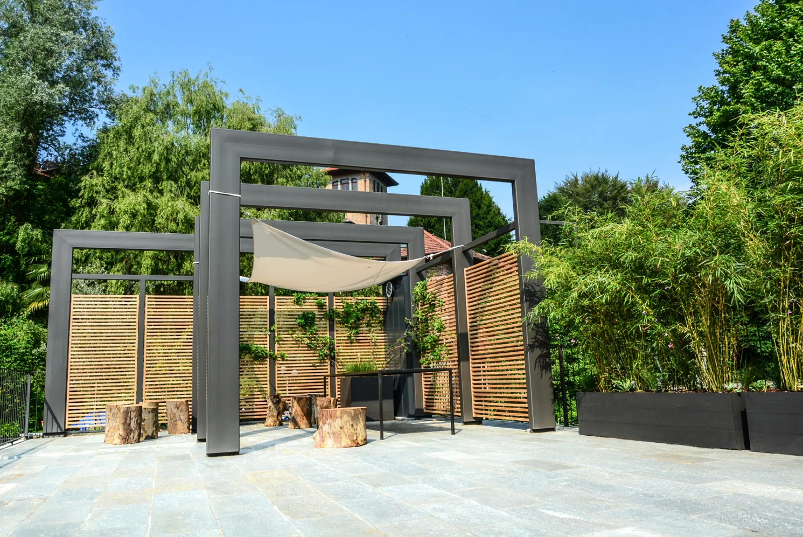 In questo bellissimo spazio esterno di uno studio di architettura abbiamo creato delle fioriere e inserito la vegetazione in armonia con la struttura della pergola esistente. Abbiamo giocato con colori vivaci e texture fogliari differenti. I punti focali sono stati valorizzati da esemplari arbustivi e arborei di terza grandezza che dessero risalto allo spazio anche in altezza.